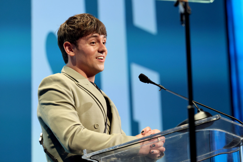 NEW YORK, NEW YORK - MARCH 03: Tom Daley speaks onstage at PFLAG National 50th Anniversary Gala at Marriott Marquis on March 03, 2023 in New York City. (Photo by Dia Dipasupil/Getty Images for PFLAG)
